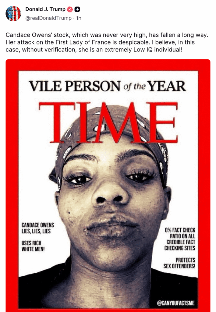 President Donald Trump unleashed his latest online tirade against conservative firebrand Candace Owens, calling the former MAGA darling “low IQ,” a frequent insult used against Black women. In a Truth Social post Friday evening, Trump wrote, “Candace Owens’ stock, which was never very high, has fallen a long way.” The U.S. president called out Owens’ […]