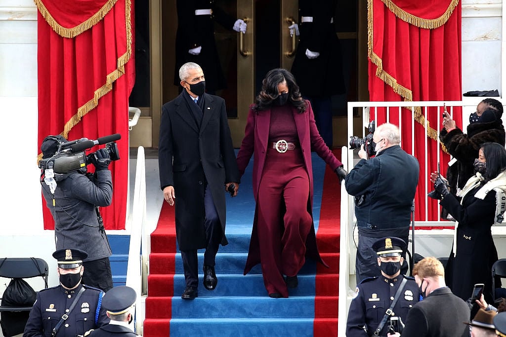 Another iconic look from Michelle Obama came four years after she left the White House: her burgundy pants and overcoat fit by Sergio Hudson, worn at the U.S. Capitol for President Joe Biden’s inauguration on Jan. 20, 2021.